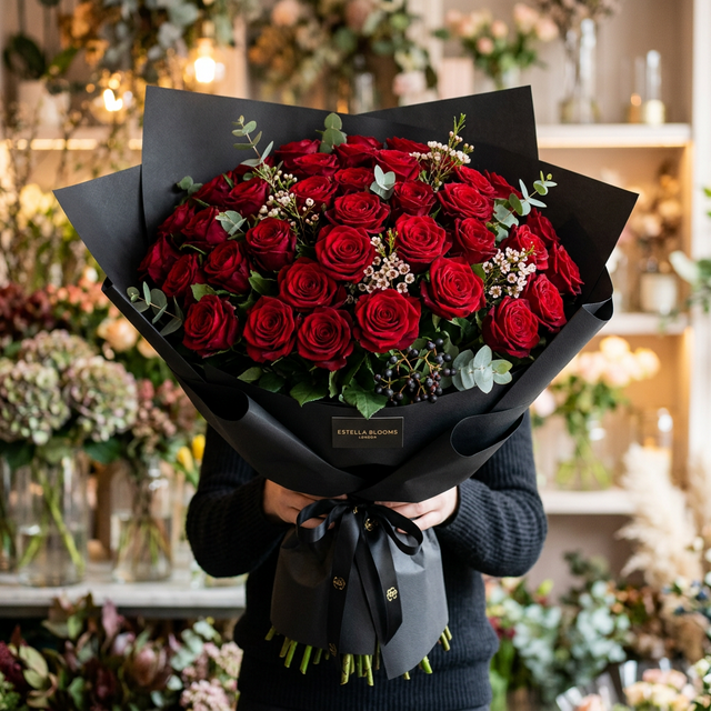 51 красная роза в черной упаковке